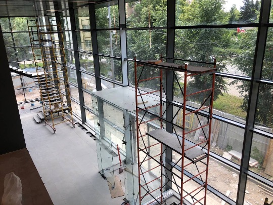 Остекление входной группы с использованием теплой и полностью герметичной раздвижной системы Alutech SL 160. Решение обеспечивает плавное и бесшумное открывание, сохраняя энергоэффективность здания и создавая современный, welcoming вход для посетителей.