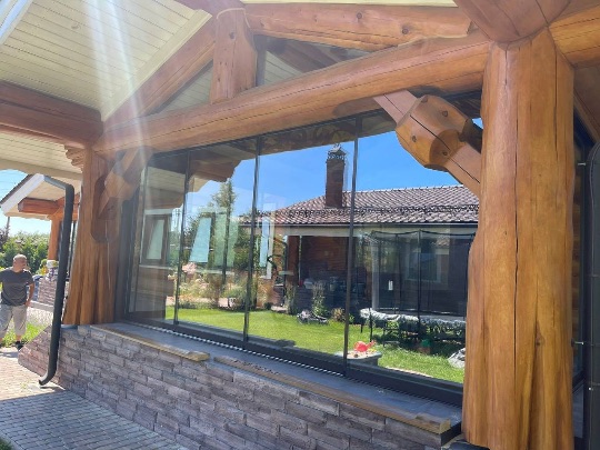Теплое остекление веранды в загородном доме с использованием раздвижной системы (слайдер) турецкого производства. Конструкция надежно защищает от непогоды и холода, позволяя превратить веранду в комфортную всесезонную гостиную с плавно сдвигающимися створками для выхода во двор.