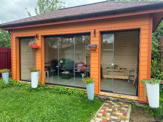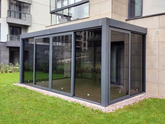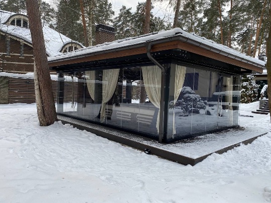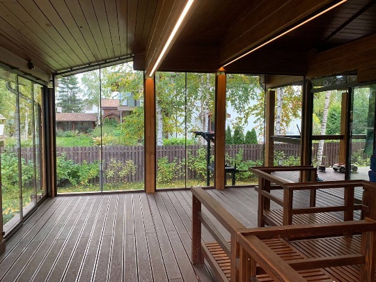 Комбинированное остекление террасы: глухое остекление и раздвижные двери (слайдеры). Глухие части обеспечивают надежную защиту и сохранение тепла, а раздвижные элементы открывают доступ на участок, создавая универсальное пространство для отдыха в любое время года.