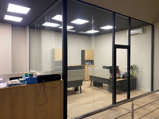 Стеклянные перегородки для внутреннего зонирования офисного пространства. Позволяют создать отдельные кабинеты и переговорные комнаты, не перегружая интерьер и сохраняя ощущение открытости, легкости и проницаемости естественного света по всему помещению.